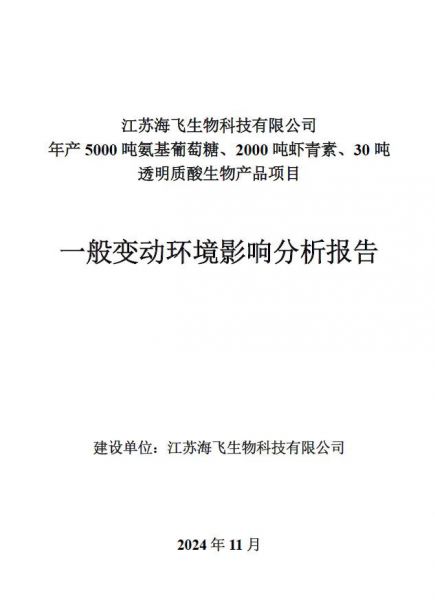 江苏海飞生物科技有限公司年产5000 吨氨基葡萄糖、2000 吨虾青素、30 吨透明质酸生物产品项目一般变动环境影响分析报告公示